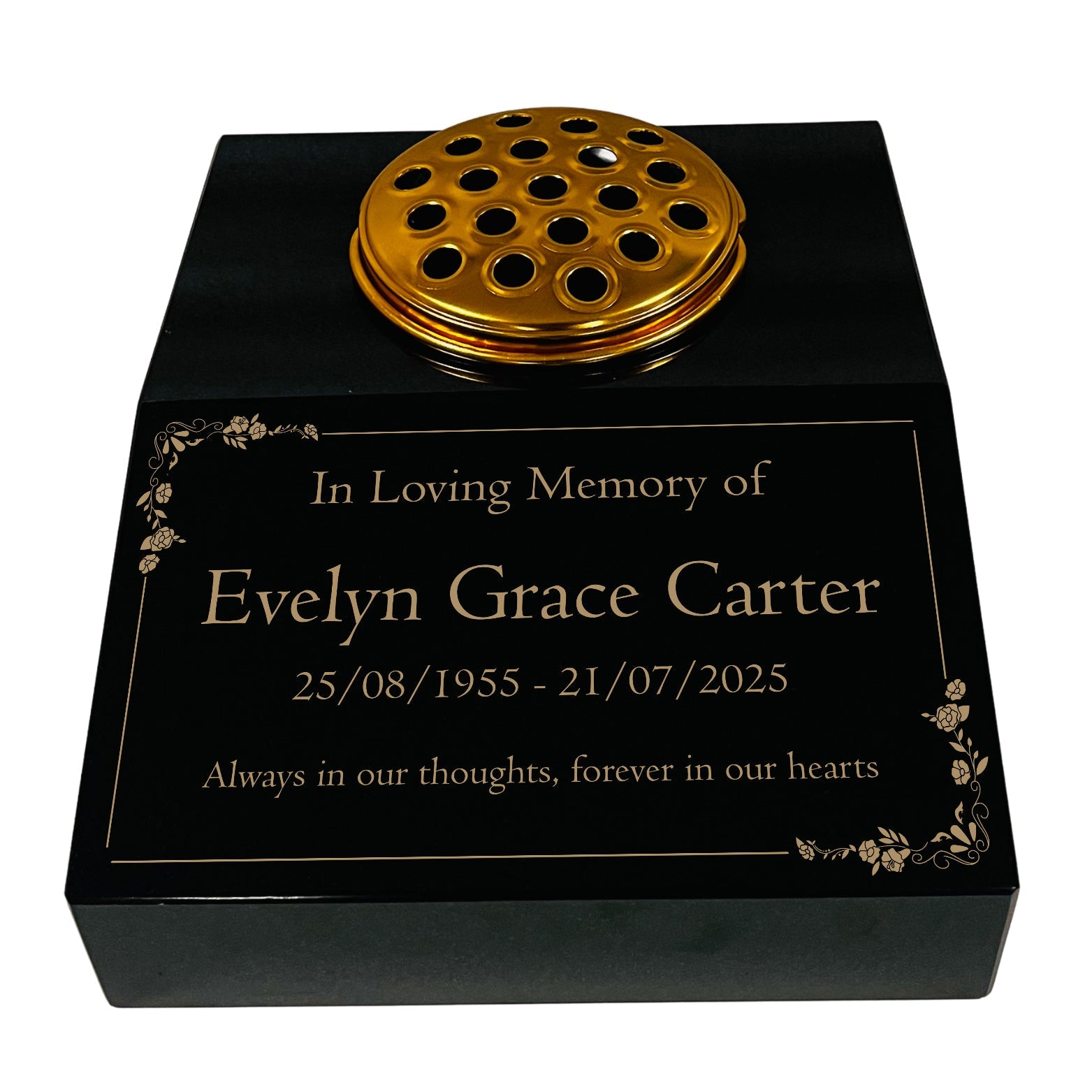 This black granite sloping memorial desk is made from solid premium black granite with a polished finish. It features a Floral design and includes free gold-filled engraving for names, dates, or a short message. A gold-coloured metal flower vase insert is included, suitable for fresh or artificial arrangements. Each piece is expertly engraved and finished in the UK, ensuring lasting quality and durability.