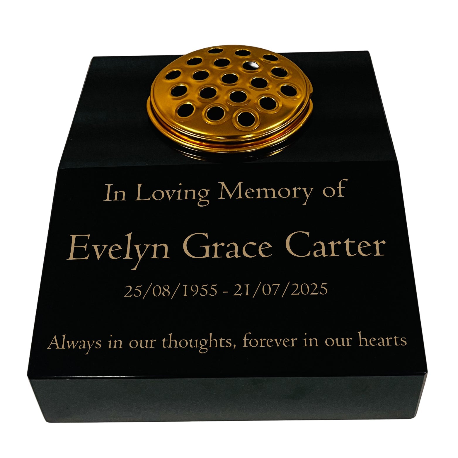 This black granite sloping memorial desk is made from solid premium black granite with a polished finish. It includes free gold-filled engraving for names, dates, or a short message. A gold-coloured metal flower vase insert is included, suitable for fresh or artificial arrangements. Each piece is expertly engraved and finished in the UK, ensuring lasting quality and durability.