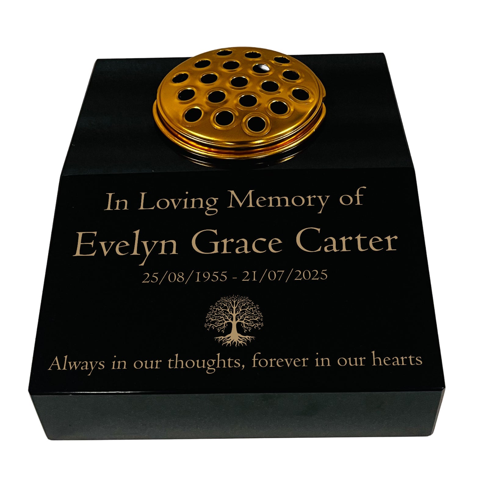 This black granite sloping memorial desk is made from solid premium black granite with a polished finish. It features a Tree of Life design and includes free gold-filled engraving for names, dates, or a short message. A gold-coloured metal flower vase insert is included, suitable for fresh or artificial arrangements. Each piece is expertly engraved and finished in the UK, ensuring lasting quality and durability.