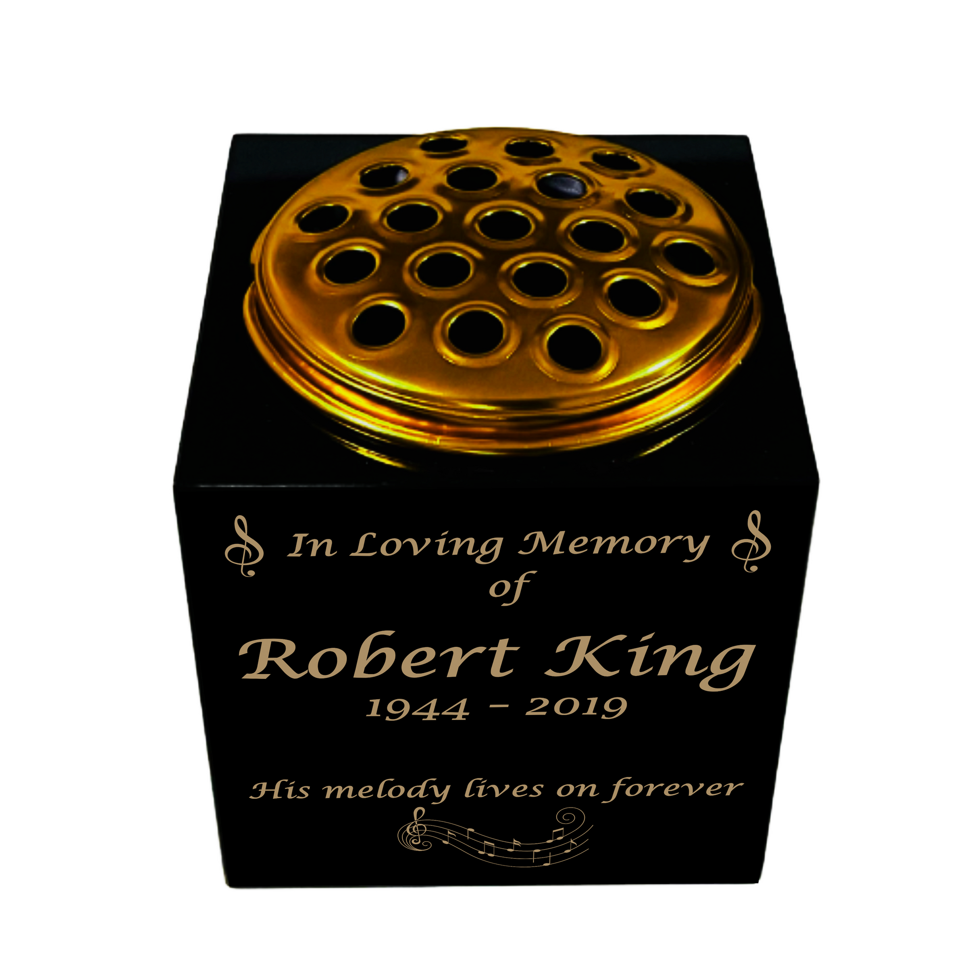 Premium Black Granite Memorial Vase- Solid Square Shape Vase – Free Personalised Gold Engraving - Musical Notes Design – Metal Flower Insert – 3 different sizes available
