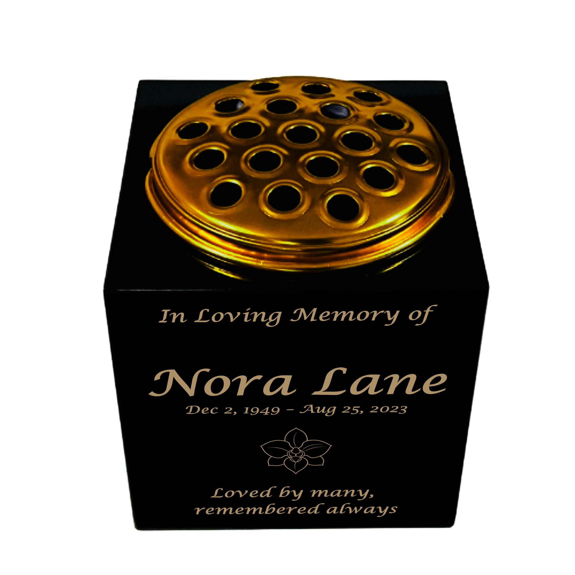 Premium Black Granite Memorial Vase- Solid Square Shape Vase – Free Personalised Gold Engraving - Orchid 2 Design – Metal Flower Insert – 3 different sizes available