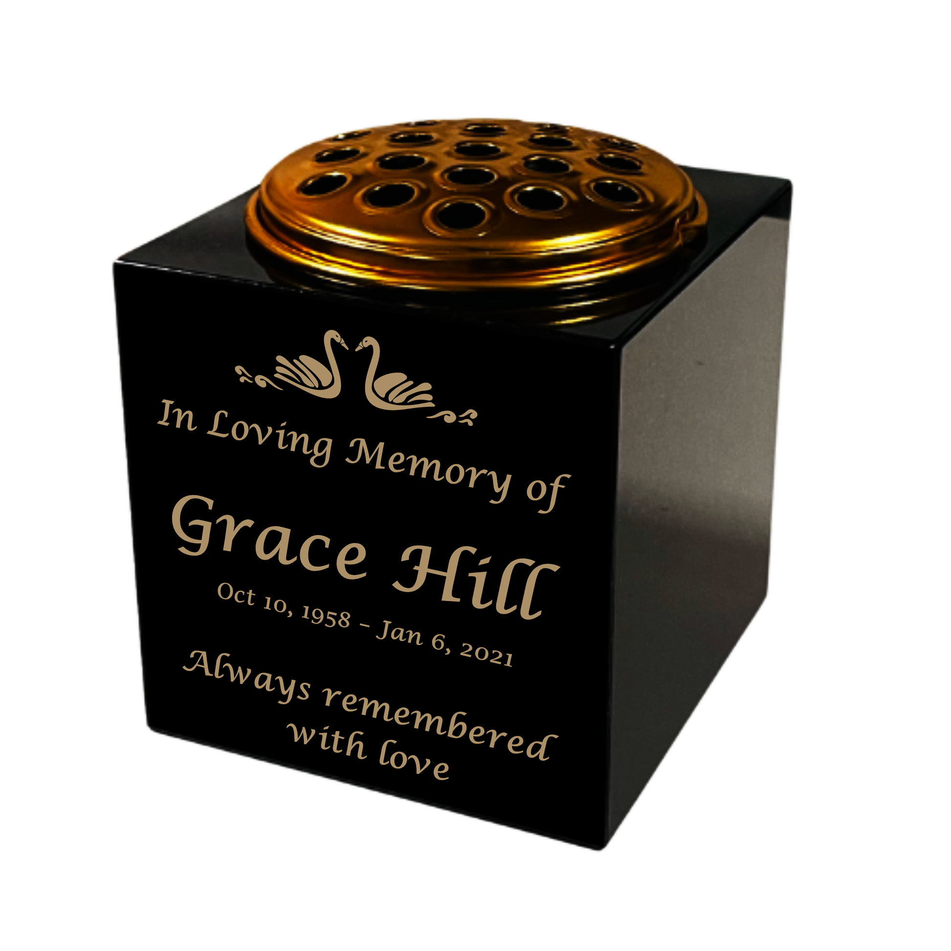 Premium Black Granite Memorial Vase- Solid Square Shape Vase – Free Personalised Gold Engraving - Swan 1 Design – Metal Flower Insert – 3 different sizes available