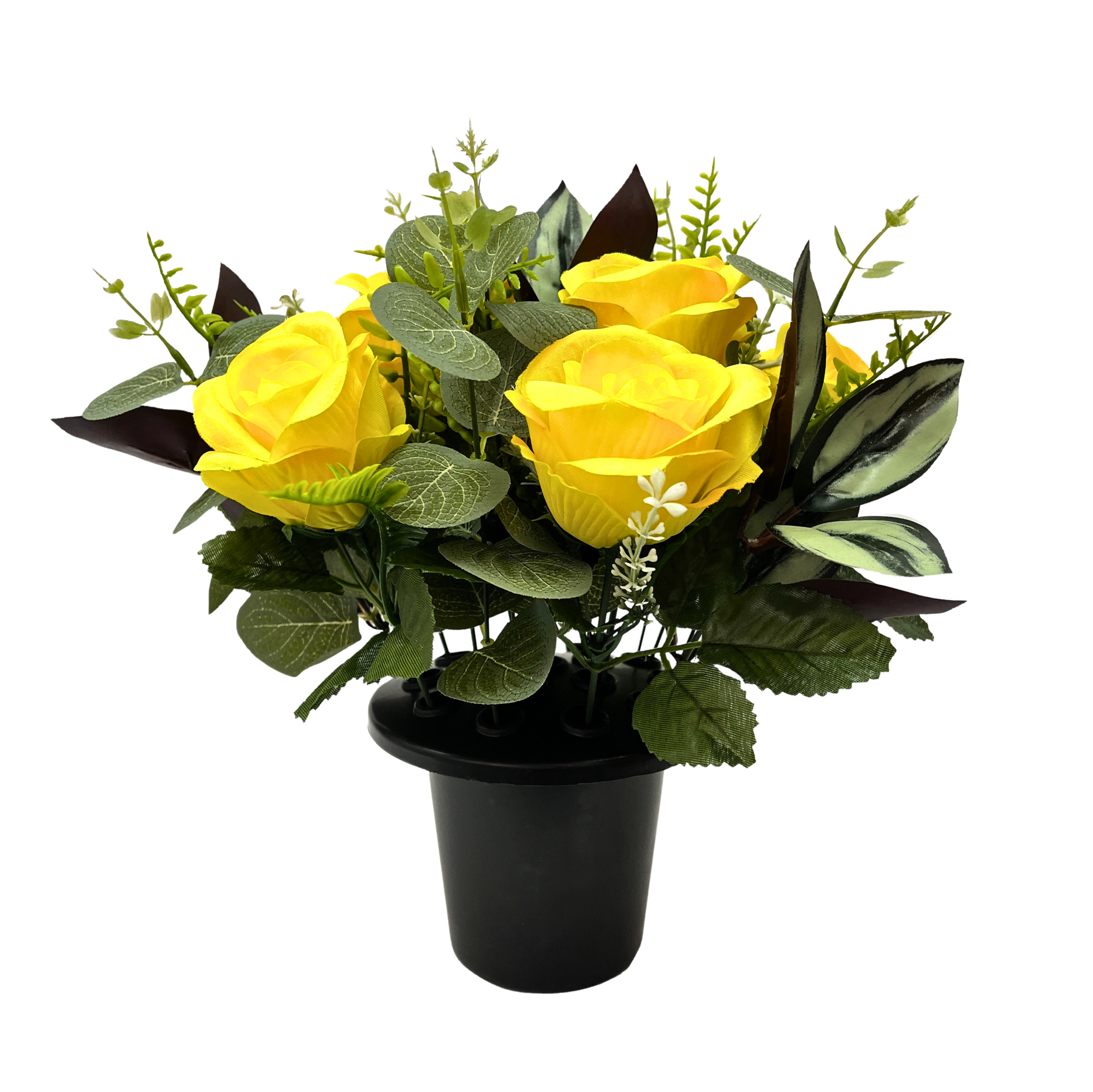 Premium Artificial Grave Flowers – Yellow Open Roses with Eucalyptus (25cm) | Memorial Vase Pot